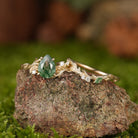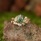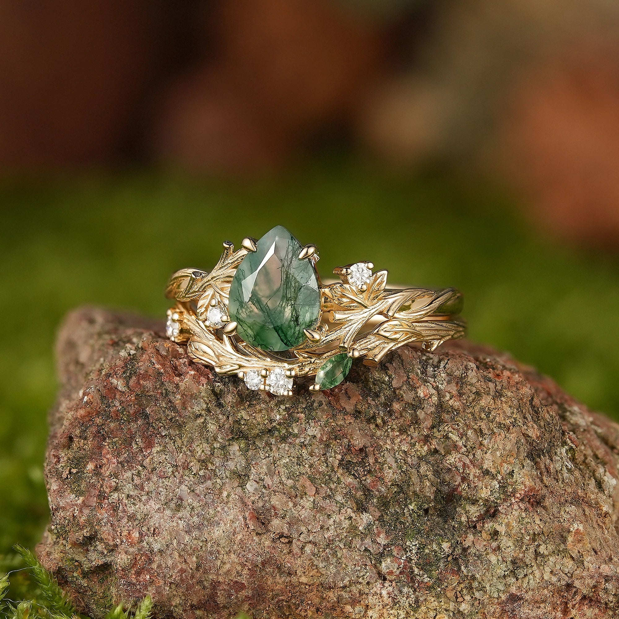 Unique Pear Cut Moss Agate Floral Engagement Ring Set Nature Inspired Leaf Branch Design Wedding Ring Yellow Gold Handmake Promise Rings For Women