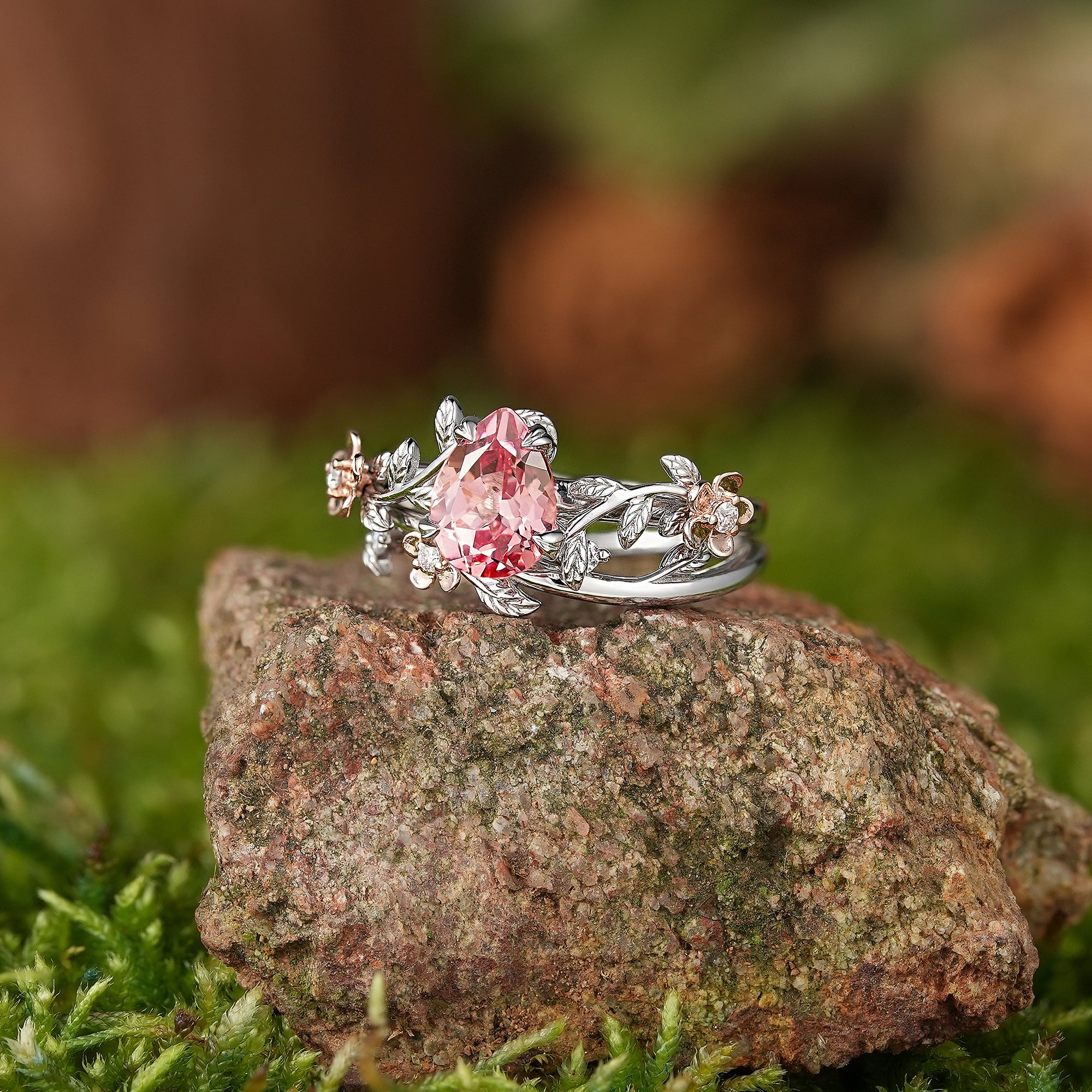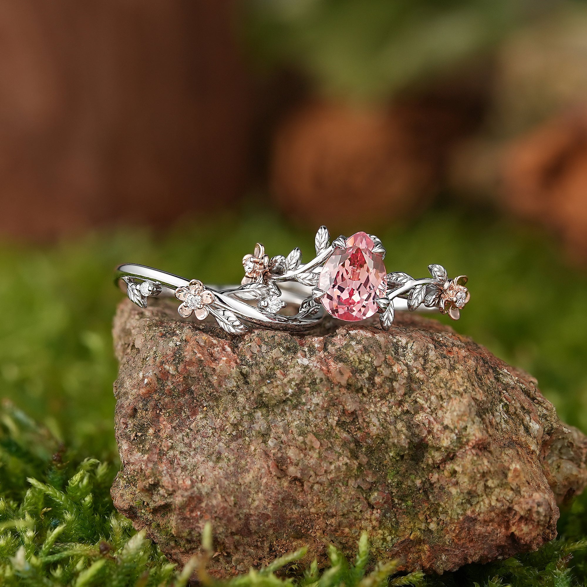 Vintage Peach Sapphire Wedding Ring Set White Gold One of a Kind Pink Sapphire Leaf Engagement Ring Leaf Wedding Band Rings For Women