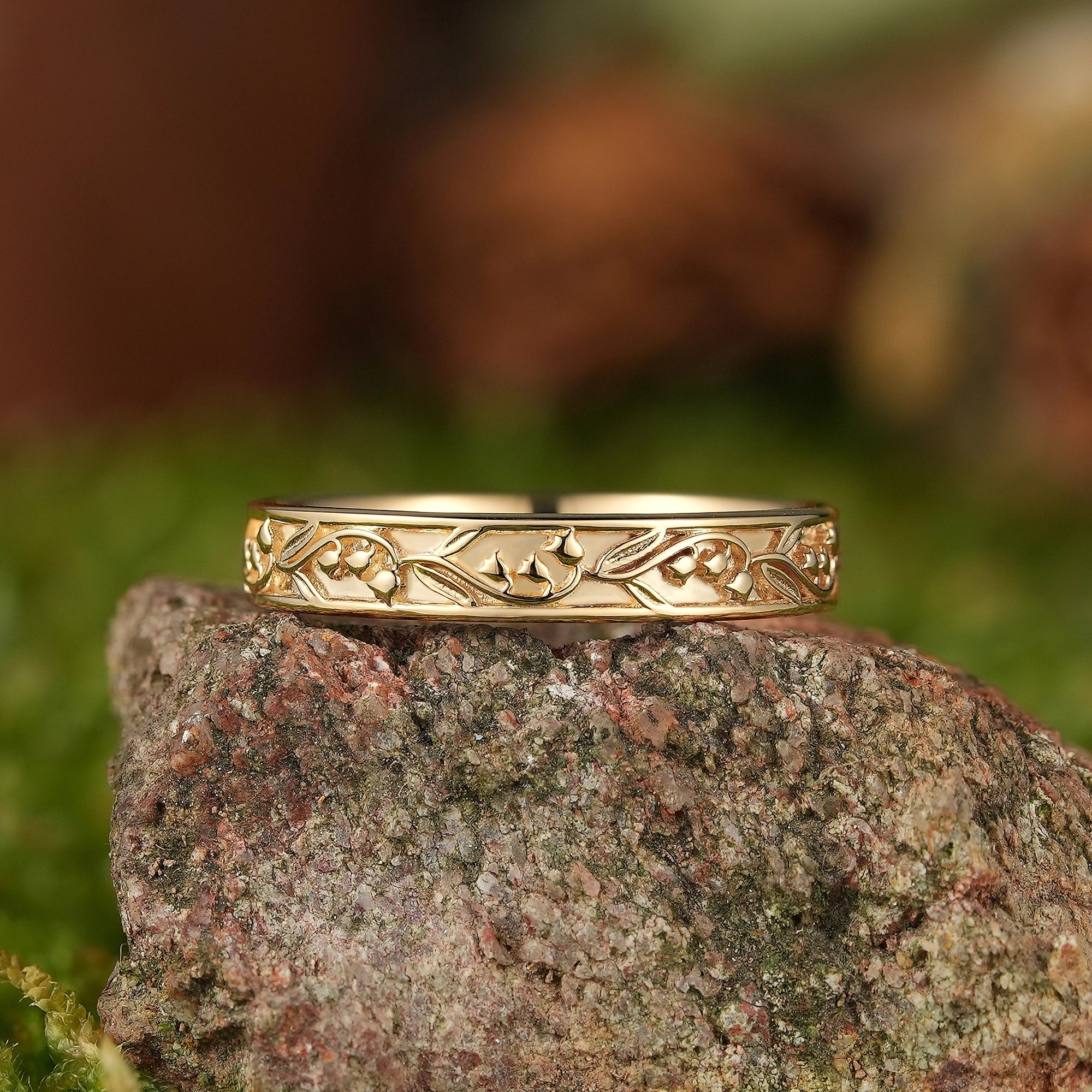 Nature Inspired Leaf Floral Mens Wedding Band Yellow Gold Llily Of The Valley Design Wedding Ring Stacking Matching Band His And Her Ring