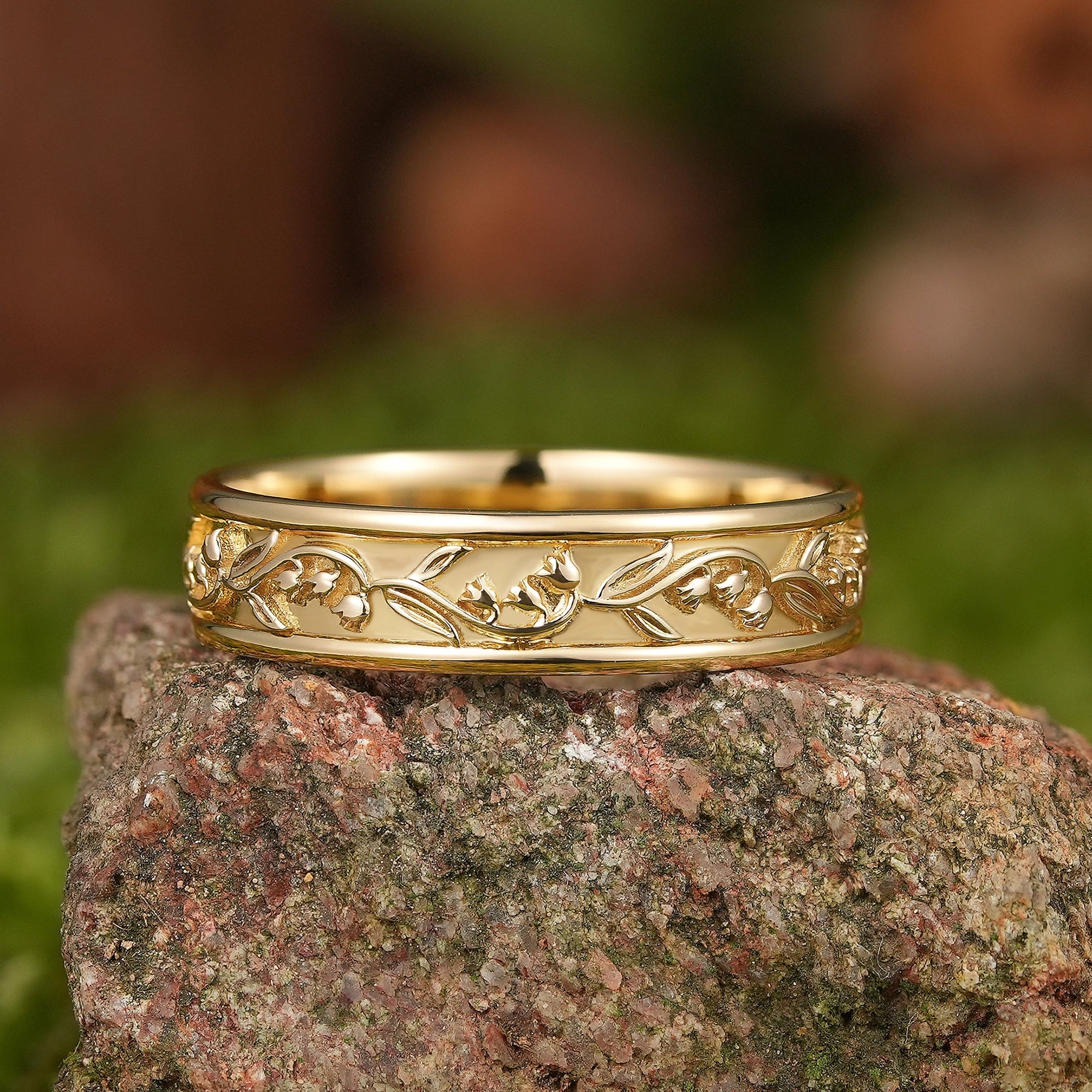 Nature Inspired Leaf Floral Mens Wedding Band Yellow Gold Slily Of The Valley Design Wedding Ring Stacking Matching Band His And Her Ring