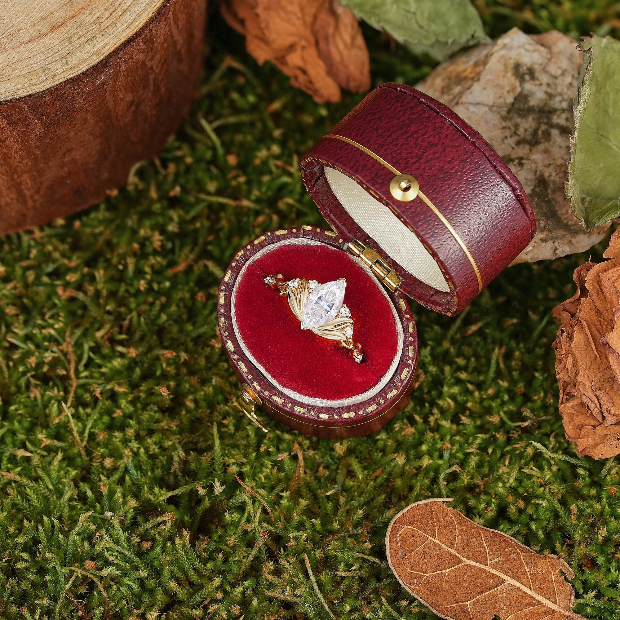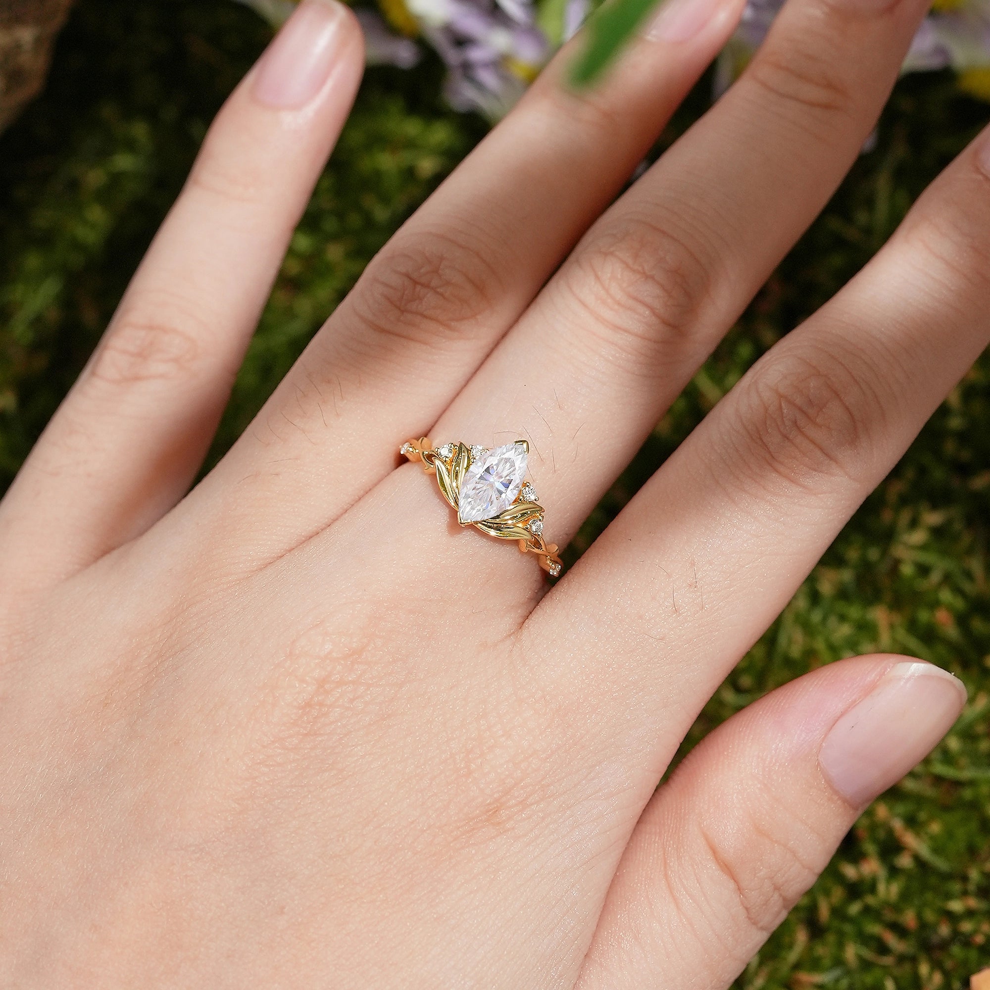 Unique Marquise Cut Moissanite Floral Engagement Ring Nature Inspired Lotus Design Wedding Ring Yellow Gold Handmake Promise Rings For Women