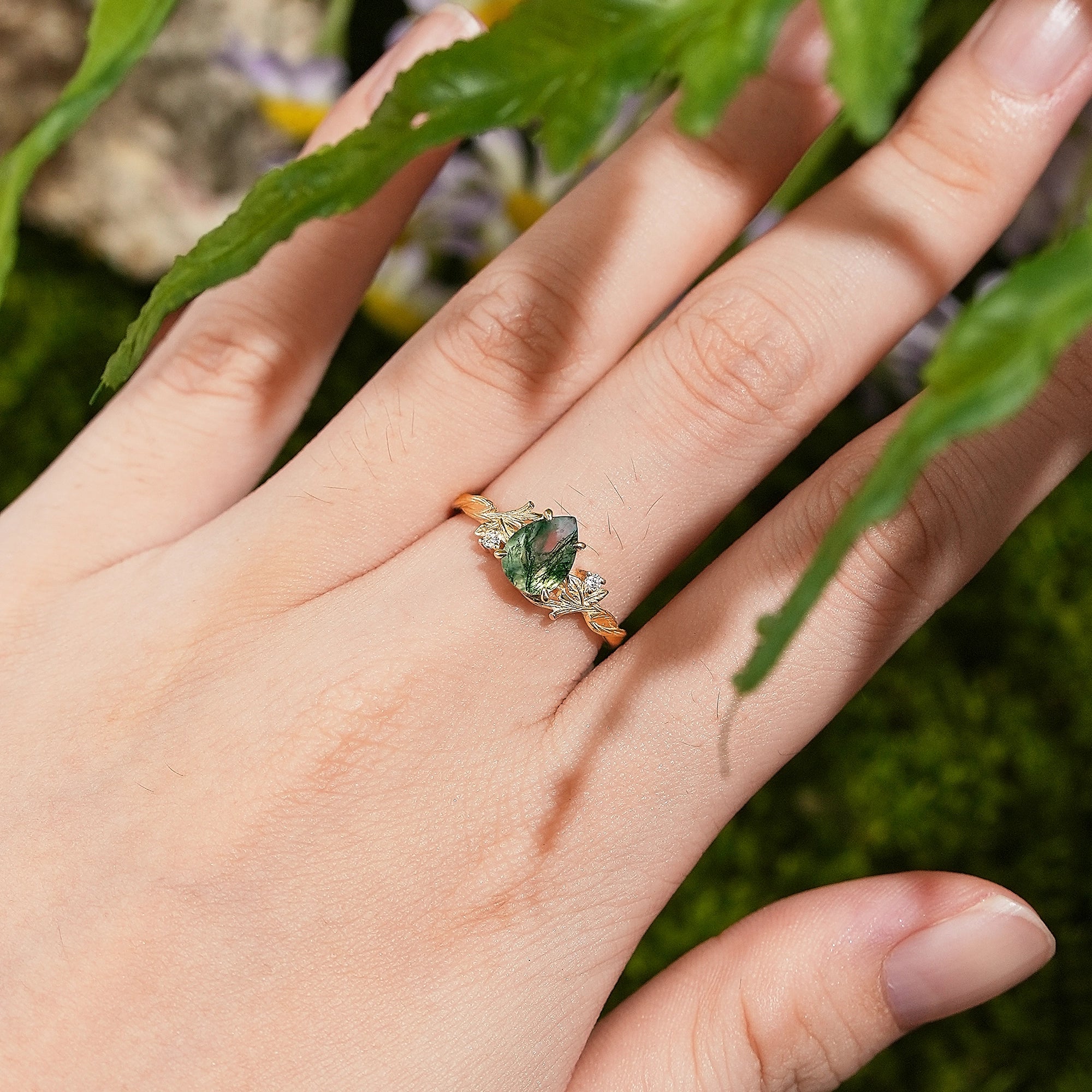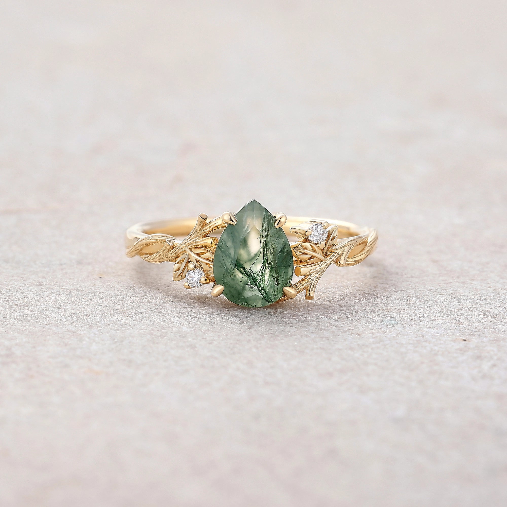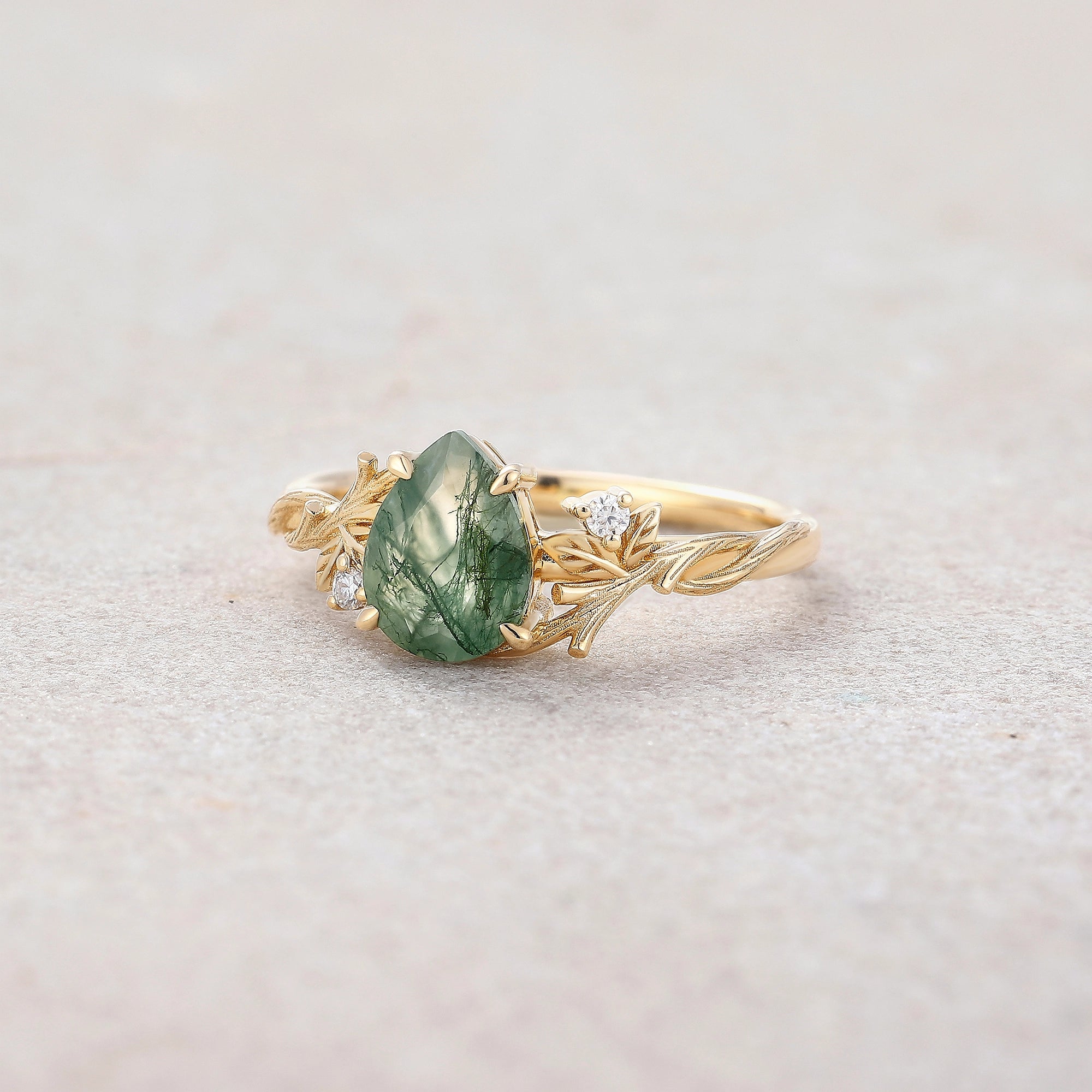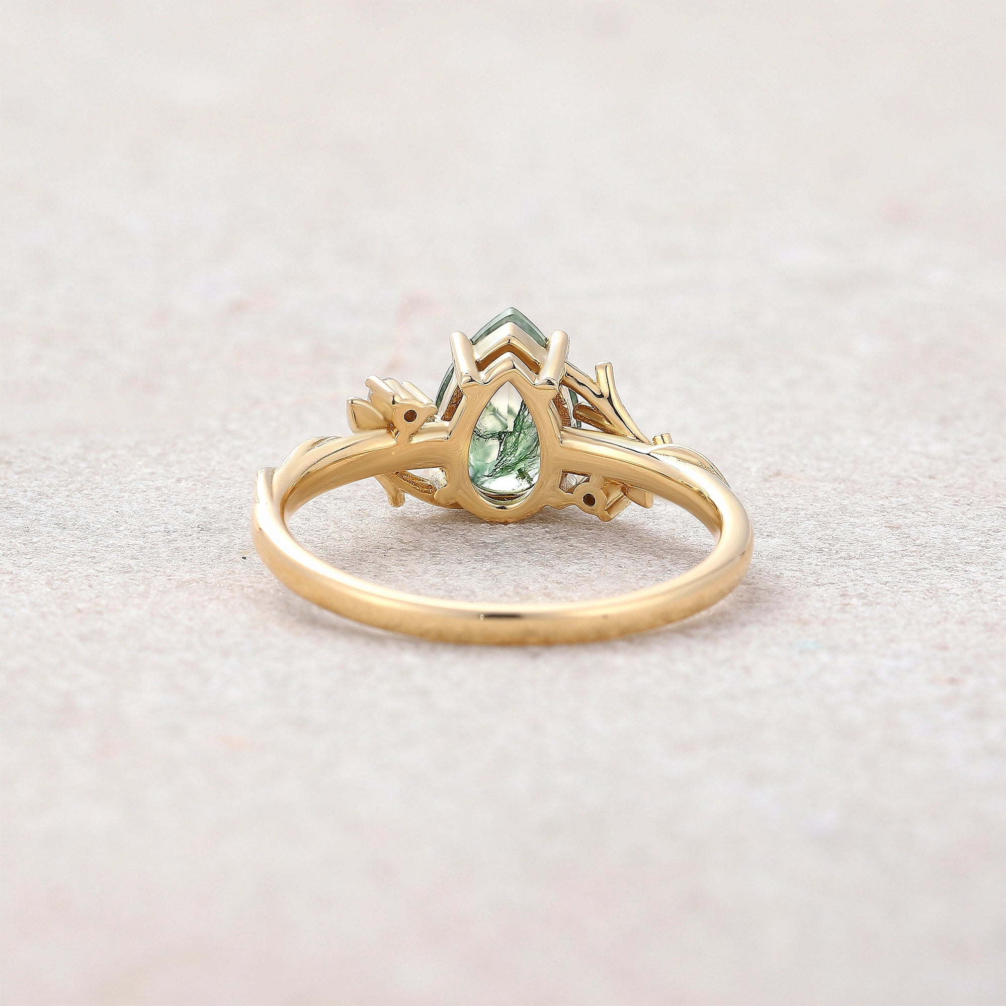 Yellow Gold Bark Design Twig Engagement Ring Pear Cut Moss Agate Wedding Ring Promise Rings For Women
