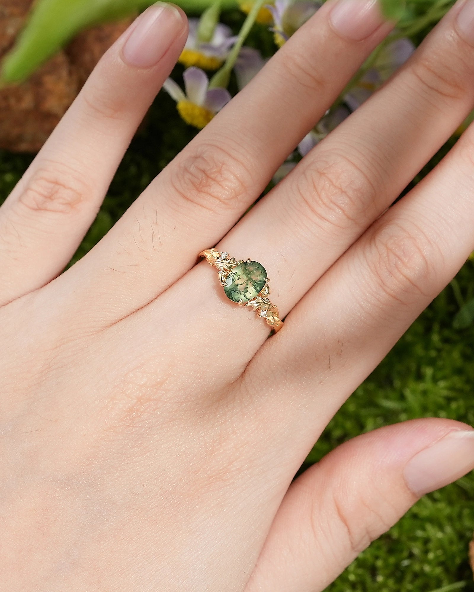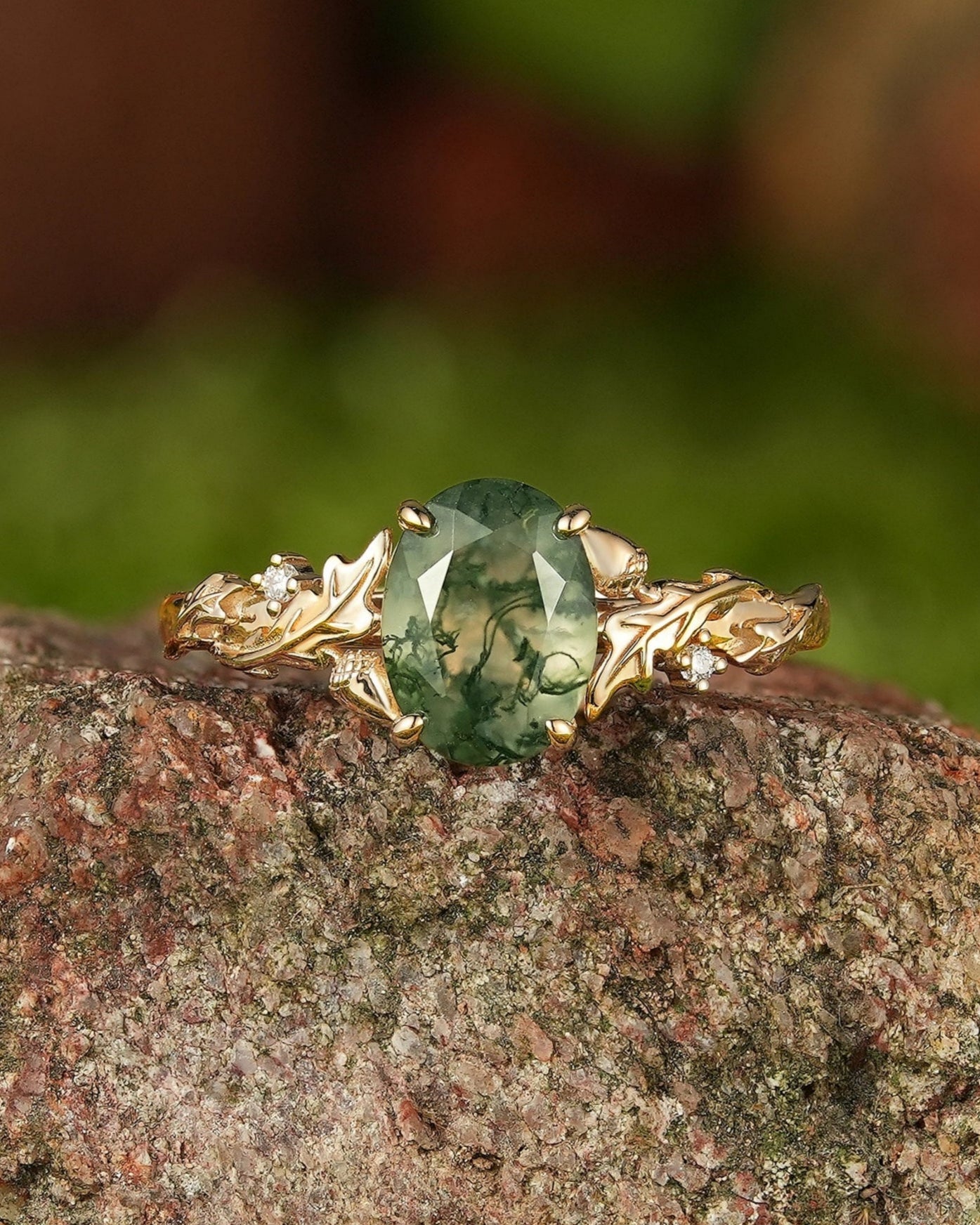 Our handcrafted designs utilize gemstones such as sapphire, moss agate, and sandstone, each imbued with a unique story and energy. Here you can choose from natural oval moss agate engagement rings, sapphire leaf and moon designs, and starry sandstone ring sets.