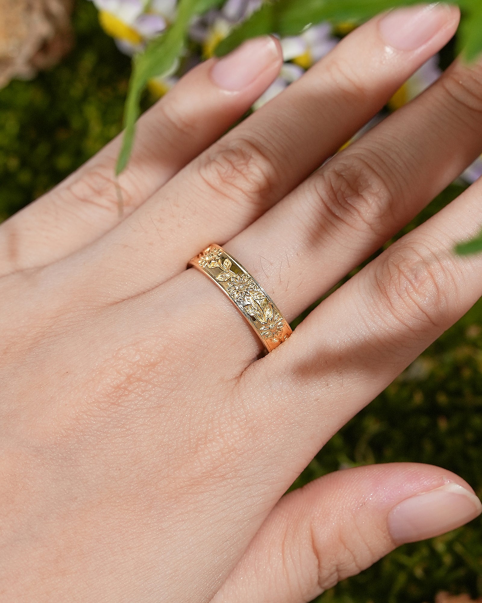 Each sunflower faces the sun, symbolizing a firm pursuit and positive strength. This ring, like a sunflower blooming on your fingertips, brings warmth and light. It is not only a piece of jewelry, but also a love for life and infinite expectations for the future.