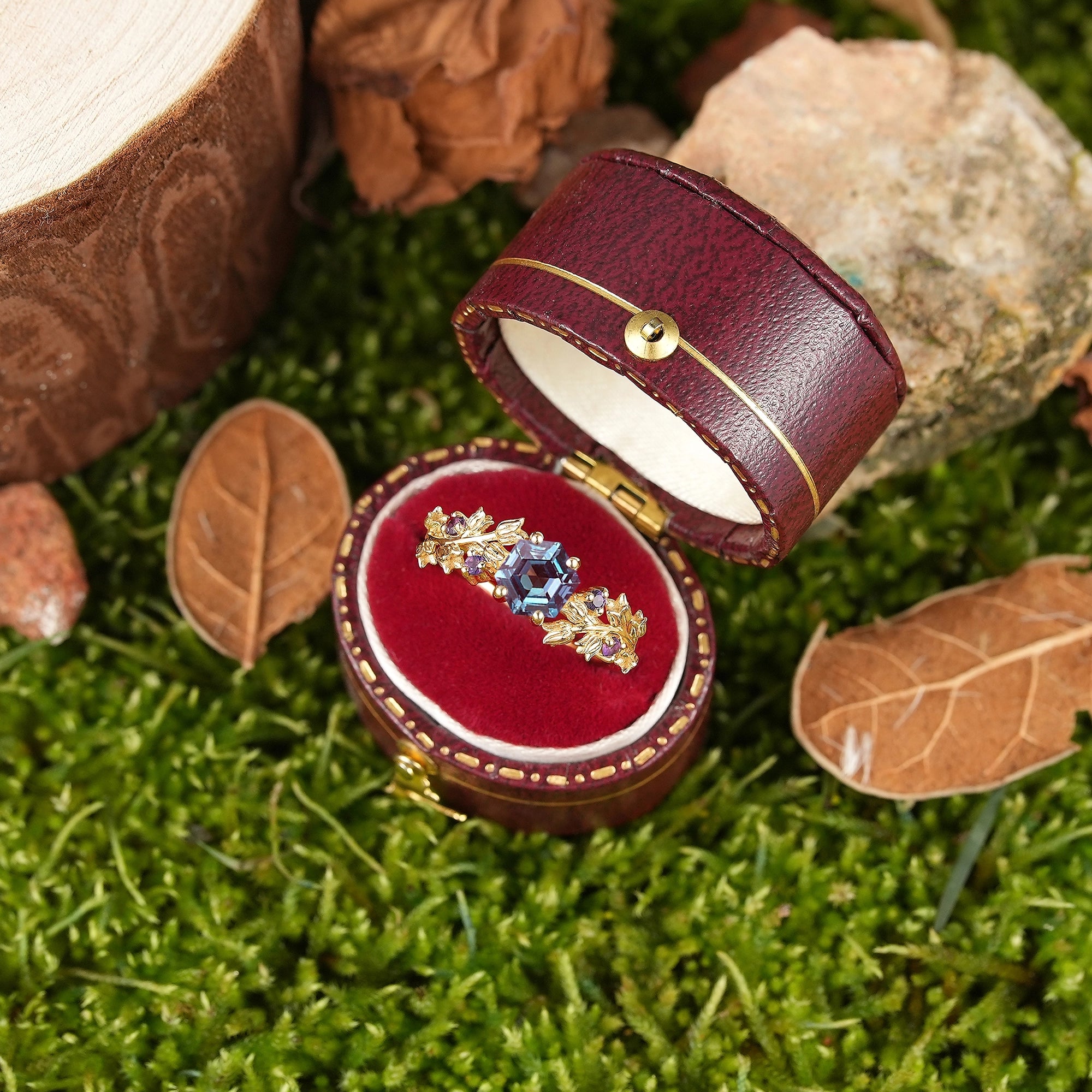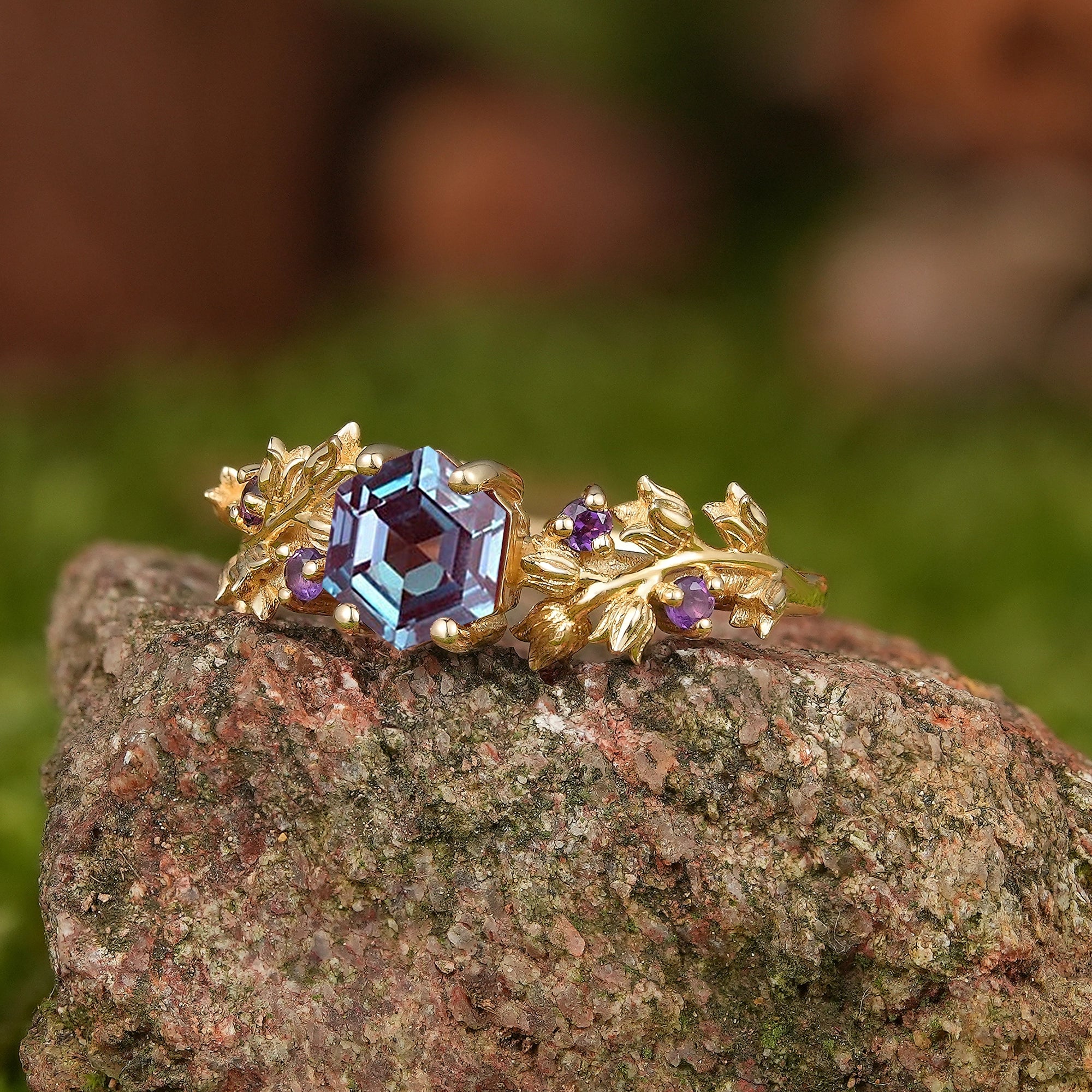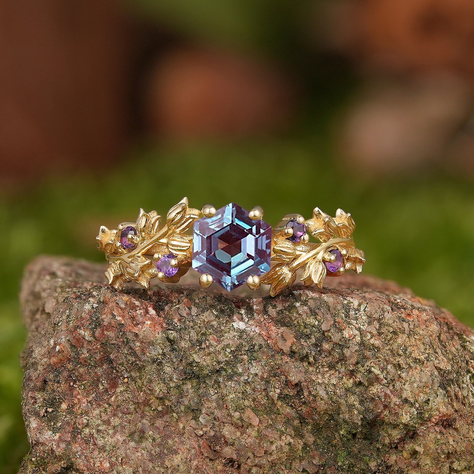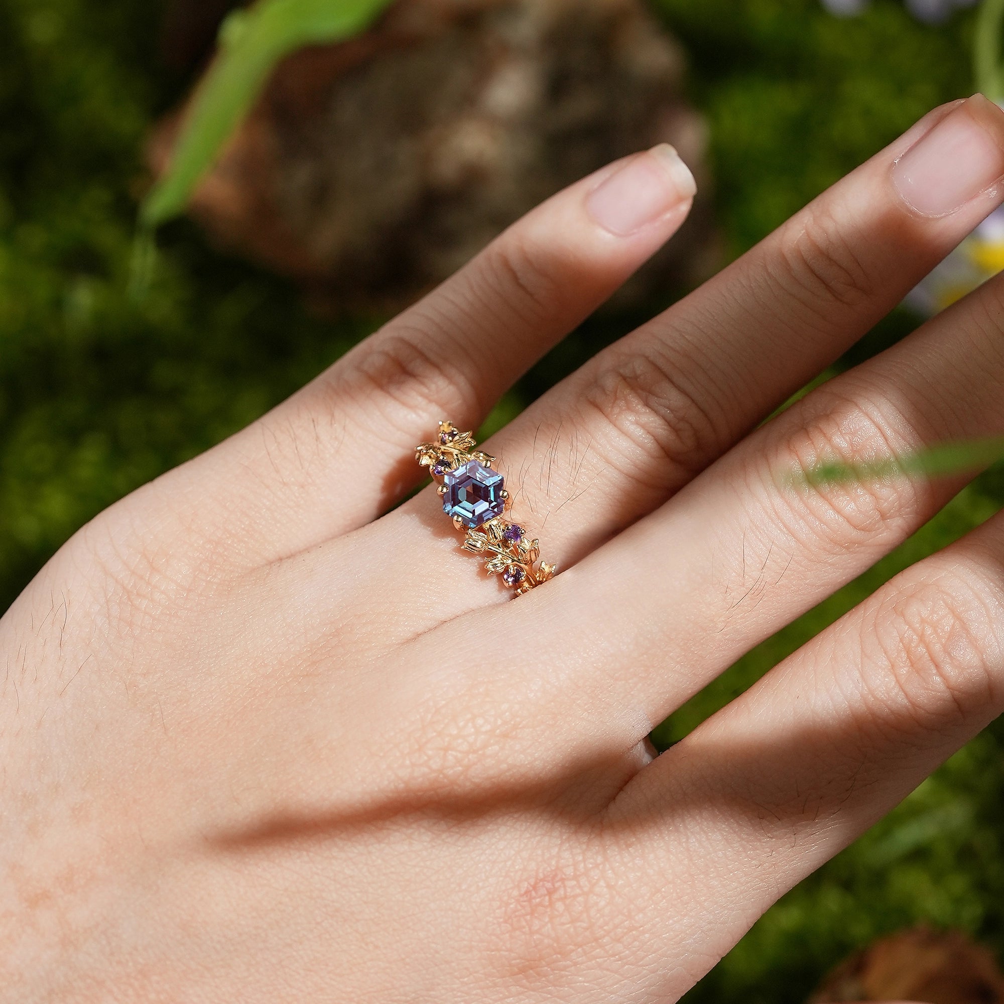 Hexagon Alexandrite Floral Engagement Ring Nature Inspired lily of the valley Wedding Ring Yellow Gold Handmake Promise Rings For Women