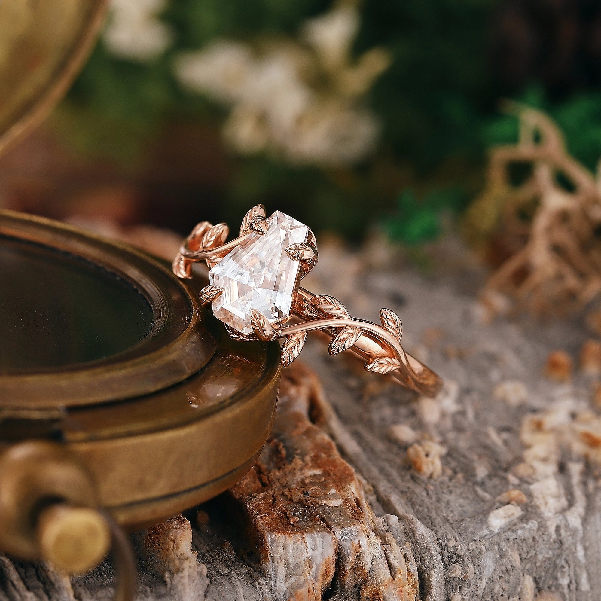 Unique Coffin Cut Moissanite Engagement Ring Yellow Gold Nature Inspired Leaf Design Wedding Ring Custom Promise Rings For Women