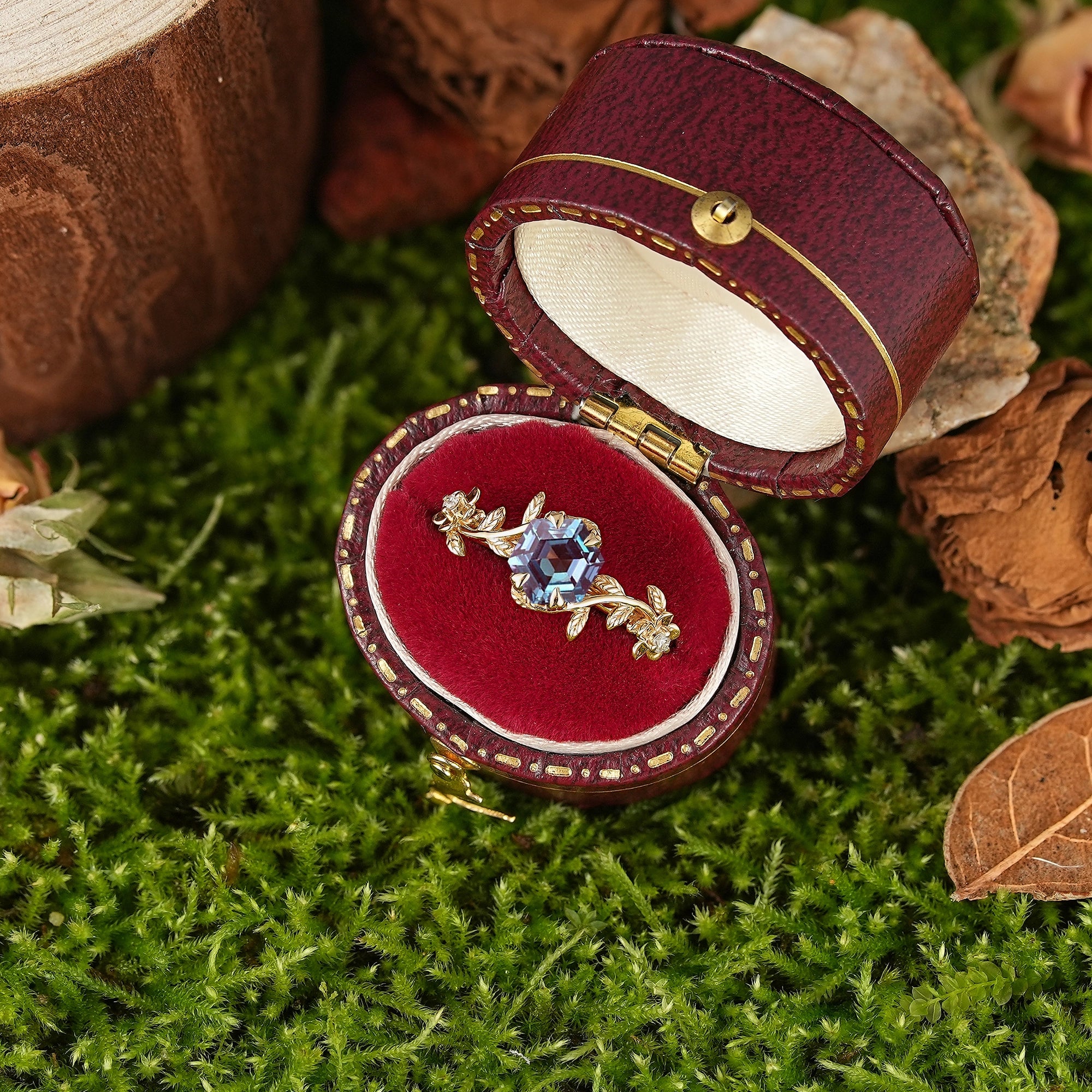 LCCjewelry | Unique Hexagon Alexandrite Leaf Flower Engagement Ring