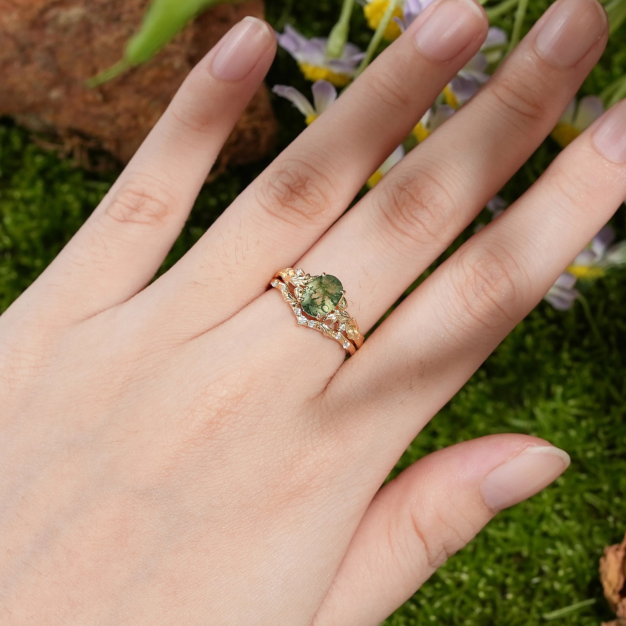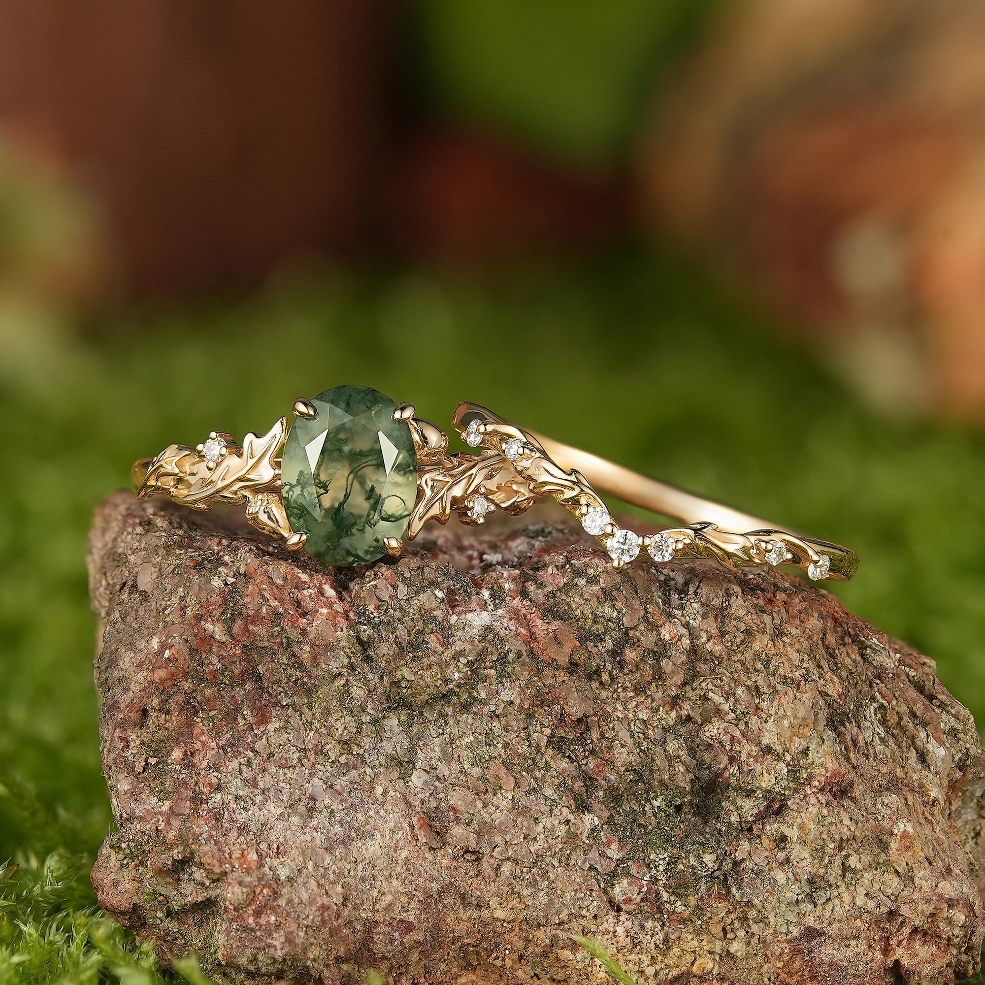 Unique Oval Cut Moss Agate Floral Engagement Ring Set Nature Inspired Oak Leaf Branch Design Wedding Ring Yellow Gold Handmake Promise Rings For Women