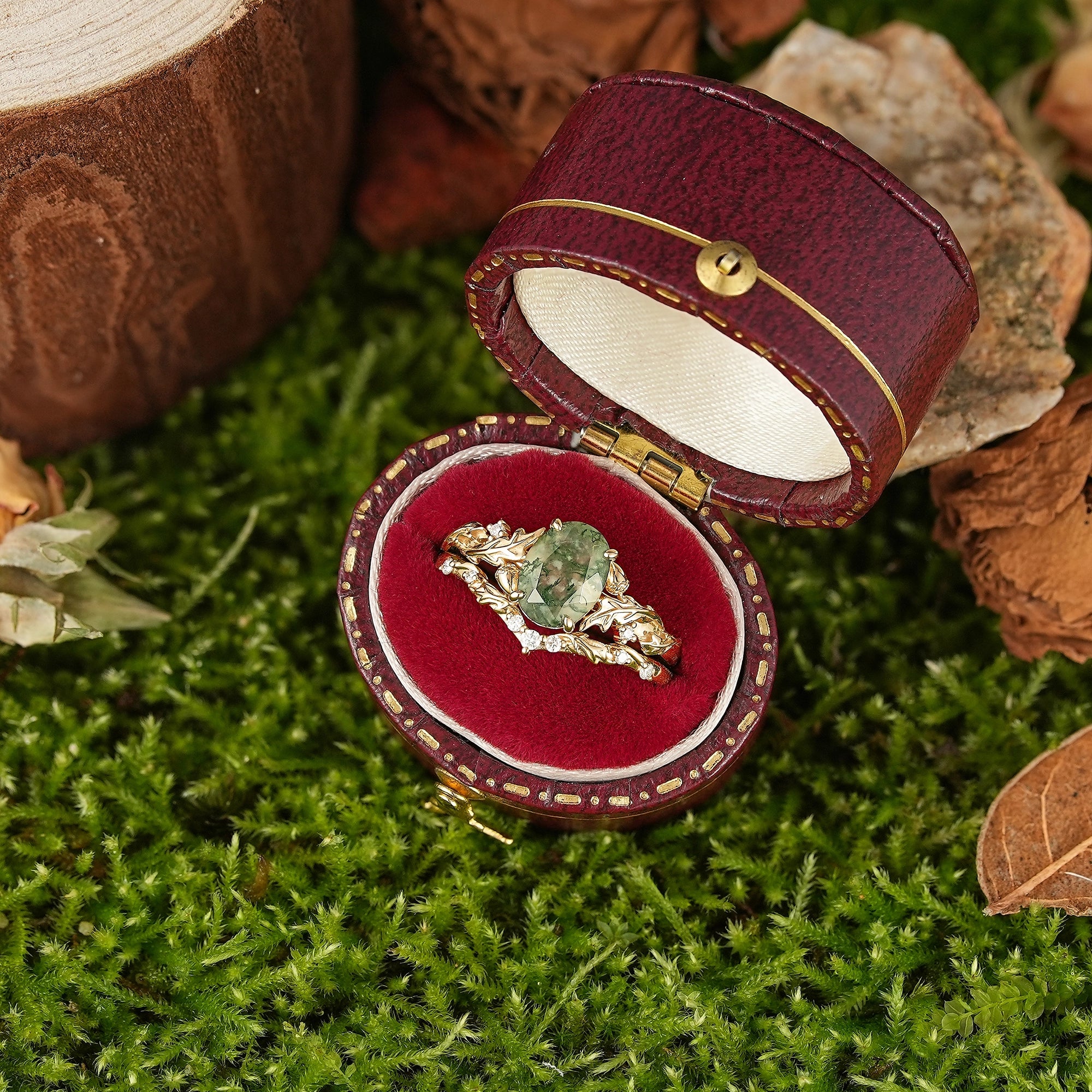 Leaf Inspired | Moss Agate Engagement Ring Set with Oak Leaf Design