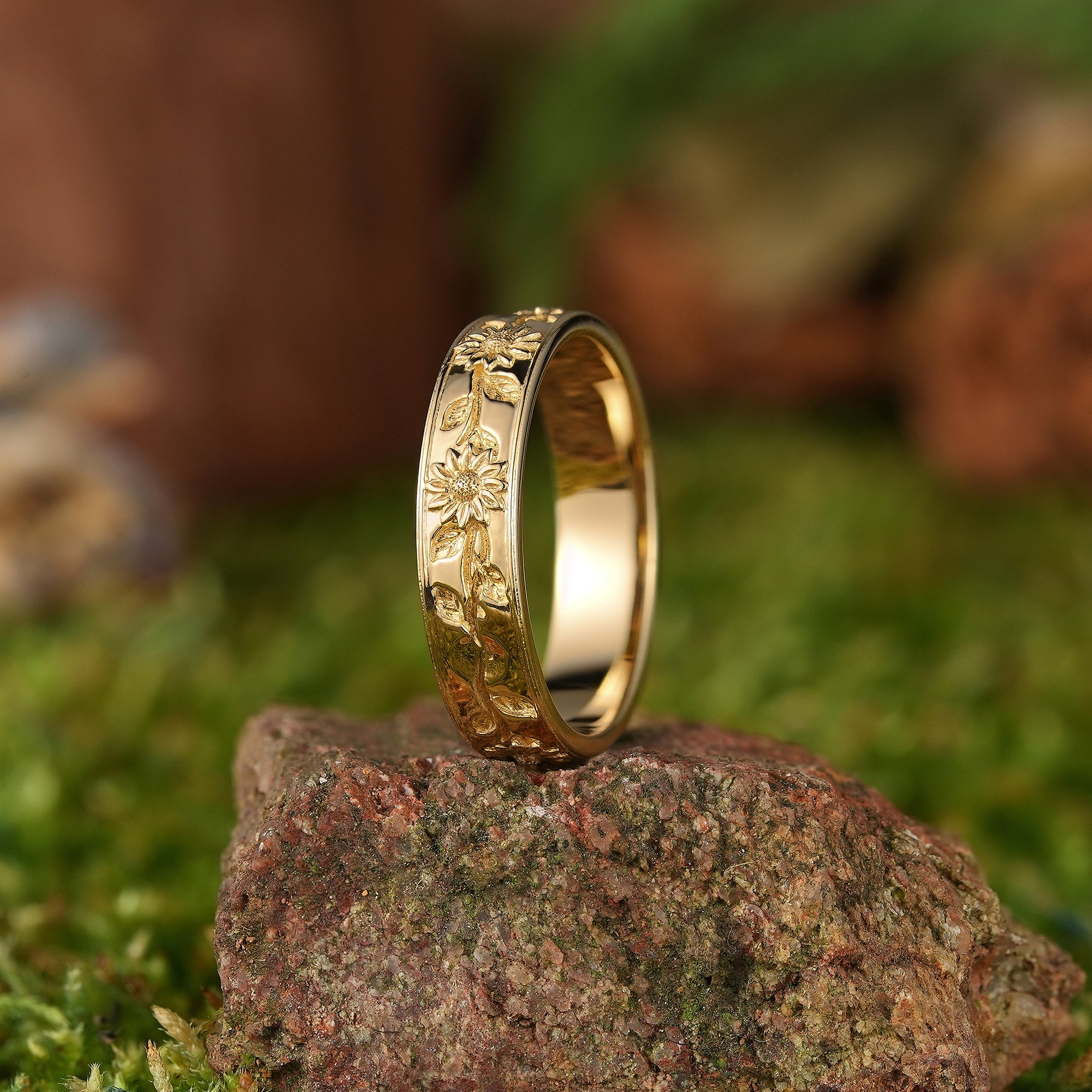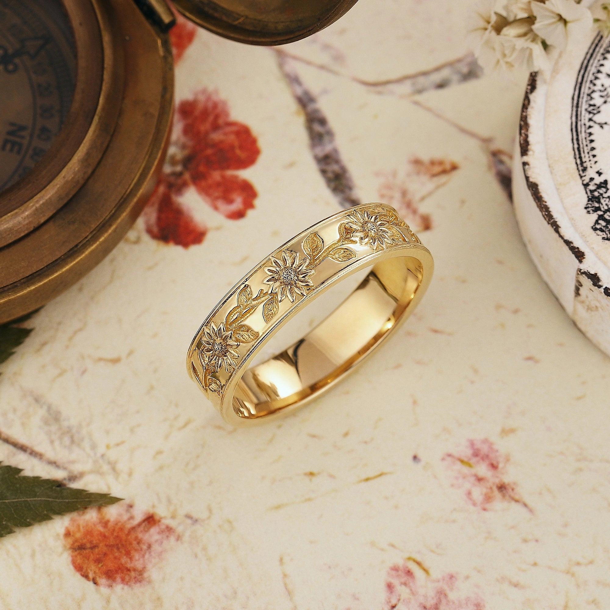 Nature Sunflower Inspired Design Mens Wedding Band Unique Yellow Gold Leaf Wedding Ring Custom Anniversary Couple Rings For Men Gift