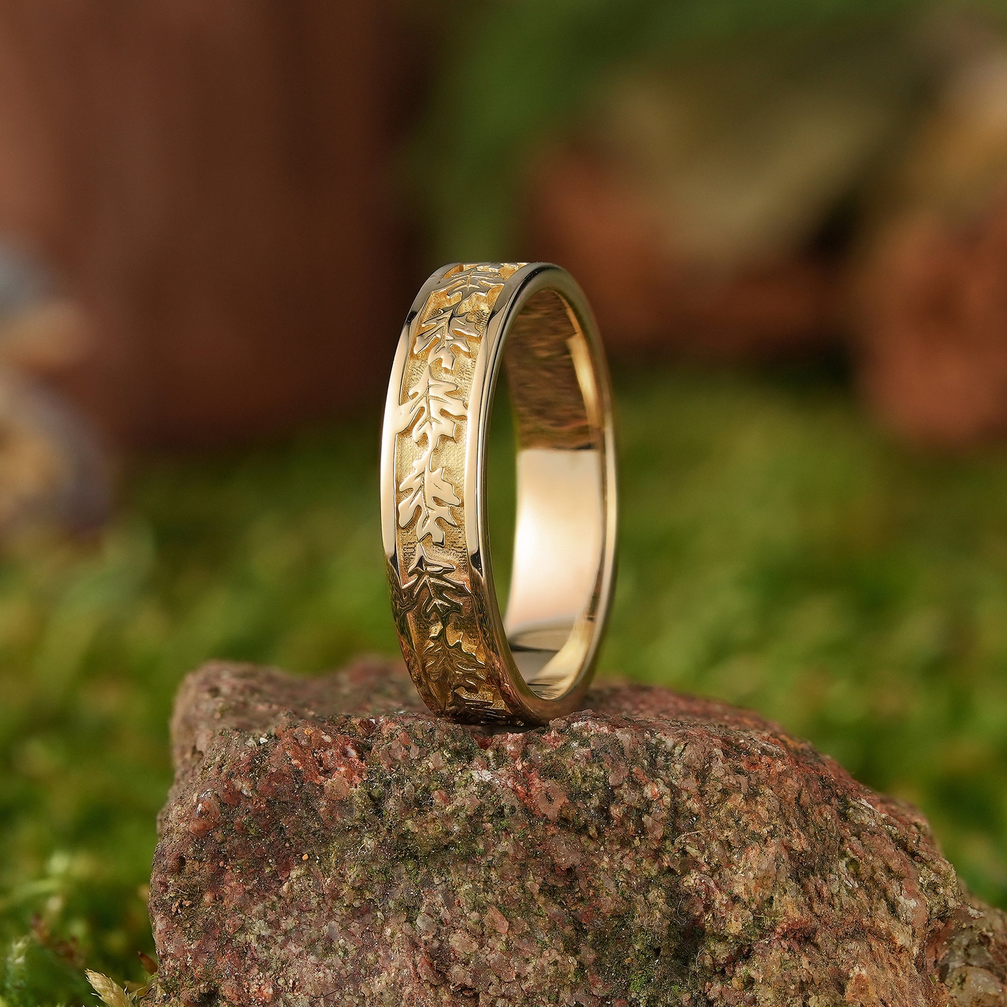 Unique Yellow Gold Oak Leaf Mens Wedding Band Nature Inspired Tree Wedding Band Stacking Matching Band Anniversary Couple Rings For Men